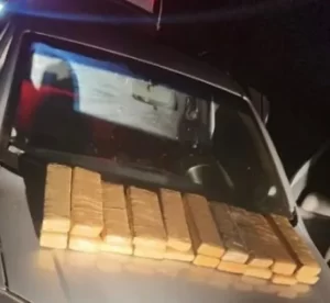 No carro foi encontrado diversos tabletes envoltos por fita adesiva contendo maconha, escondidos em vários locais do assoalho e debaixo dos bancos, totalizando 20 tabletes.